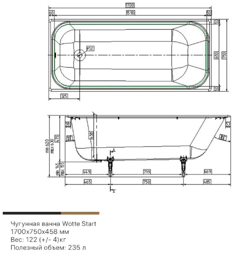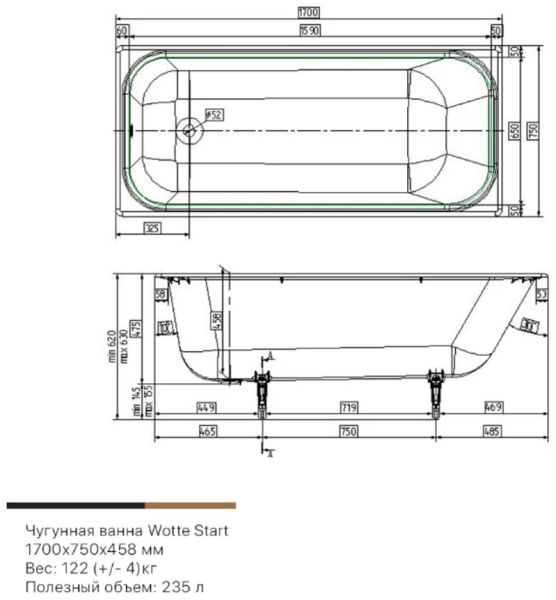 Start 1700x750Вотте Старт 1700х750х458 ванна чугунная (БП-э000001104)Габариты (д.ш.г.): 170x75x45,8 см