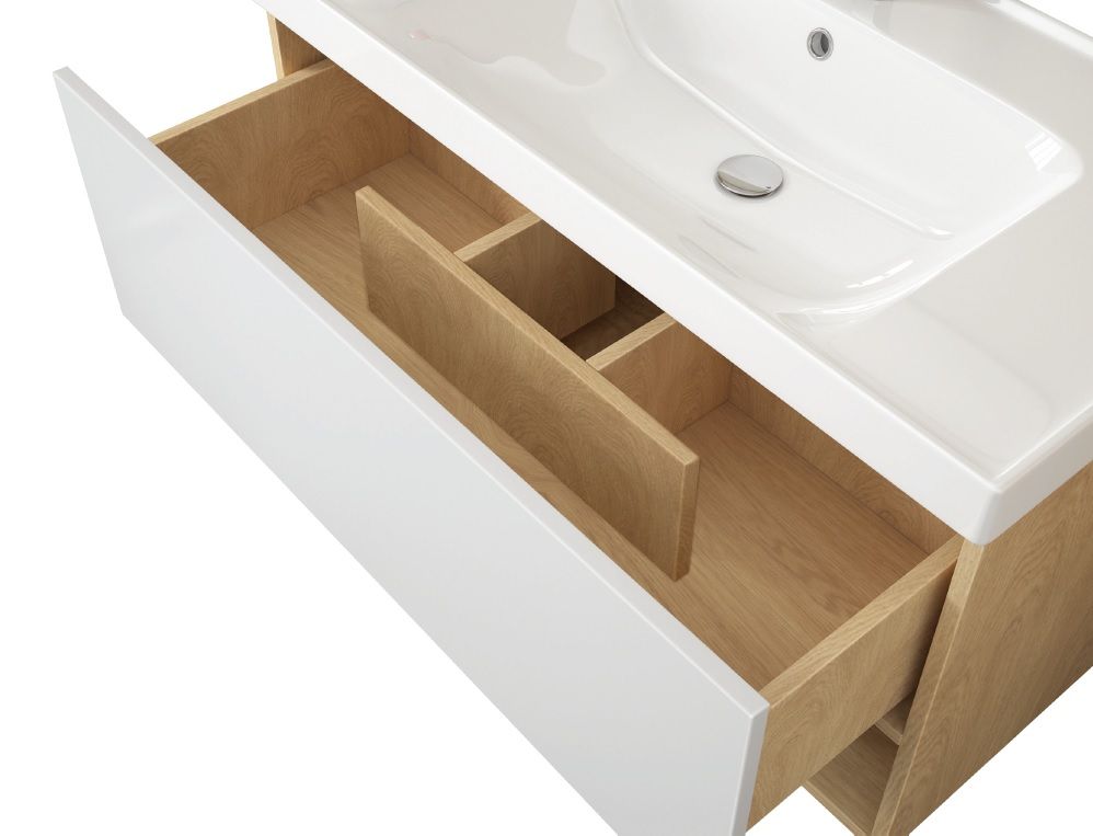 Подвесная коллекция PERFECTO под новый керамический умывальник Grace 60/70 см. Фасадные и боковые части выполнены в комбинации дуб и белый глянец (краска). Отличительной особенностью данной тумбы является открытая полочка для удобного хранения отдельных предметов