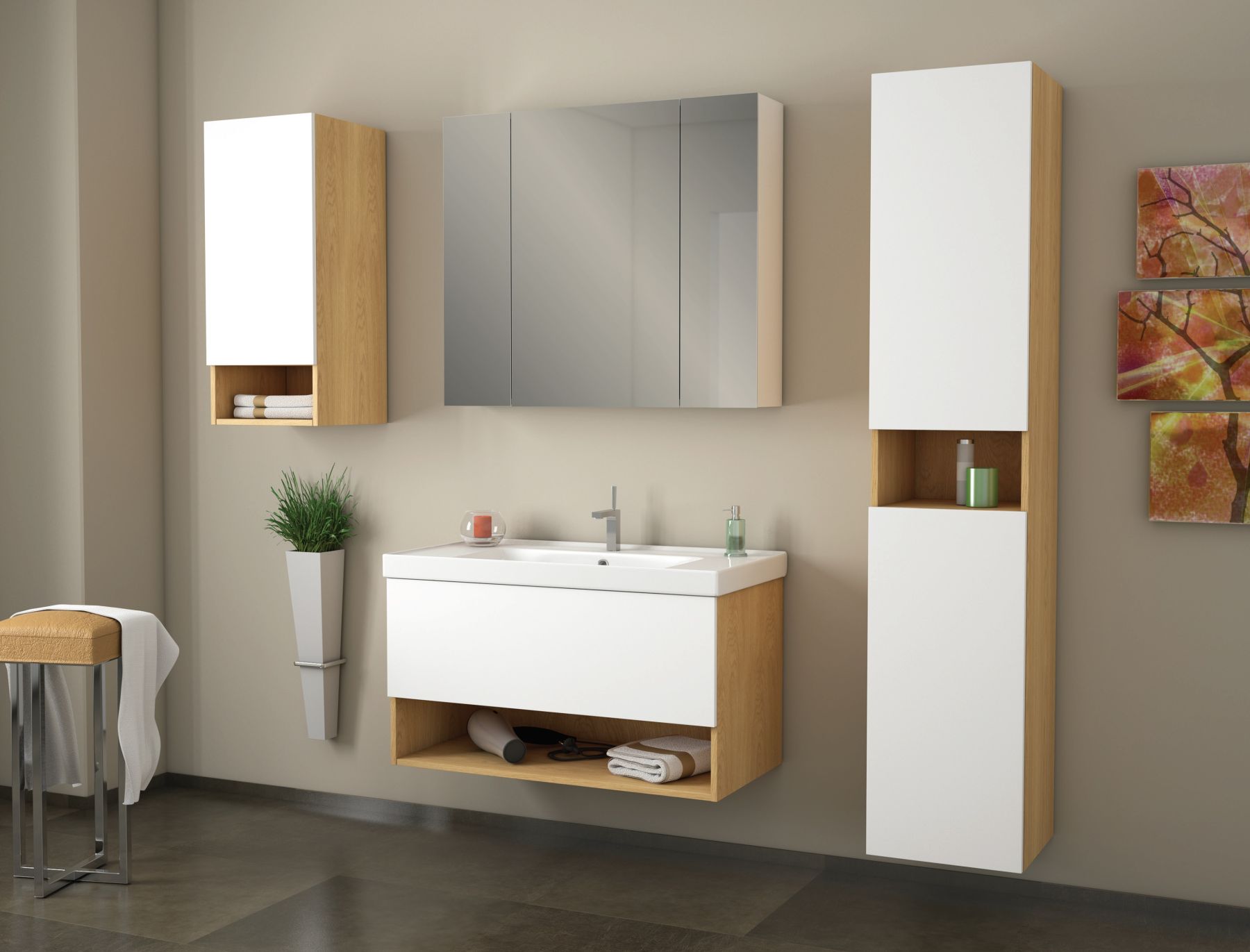 Подвесная коллекция PERFECTO под новый керамический умывальник Grace 60/70 см. Фасадные и боковые части выполнены в комбинации дуб и белый глянец (краска). Отличительной особенностью данной тумбы является открытая полочка для удобного хранения отдельных предметов