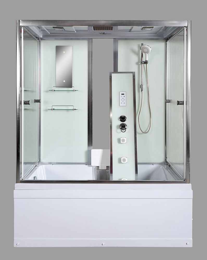Стильная душевая кабина с внутренней сборкой AvaCan V150 сочетает в себе высокую функциональность, практичность и надежность. Для изготовления применяют безопасное закаленное стекло толщиной 5 мм, надежно фиксируемое алюминиевым профилем. Цвет профиля хром. В комплекте зеркало, сенсорный пульт управления, гидромассажные форсунки, смеситель, переключатель режимов, вентиляция, радио.