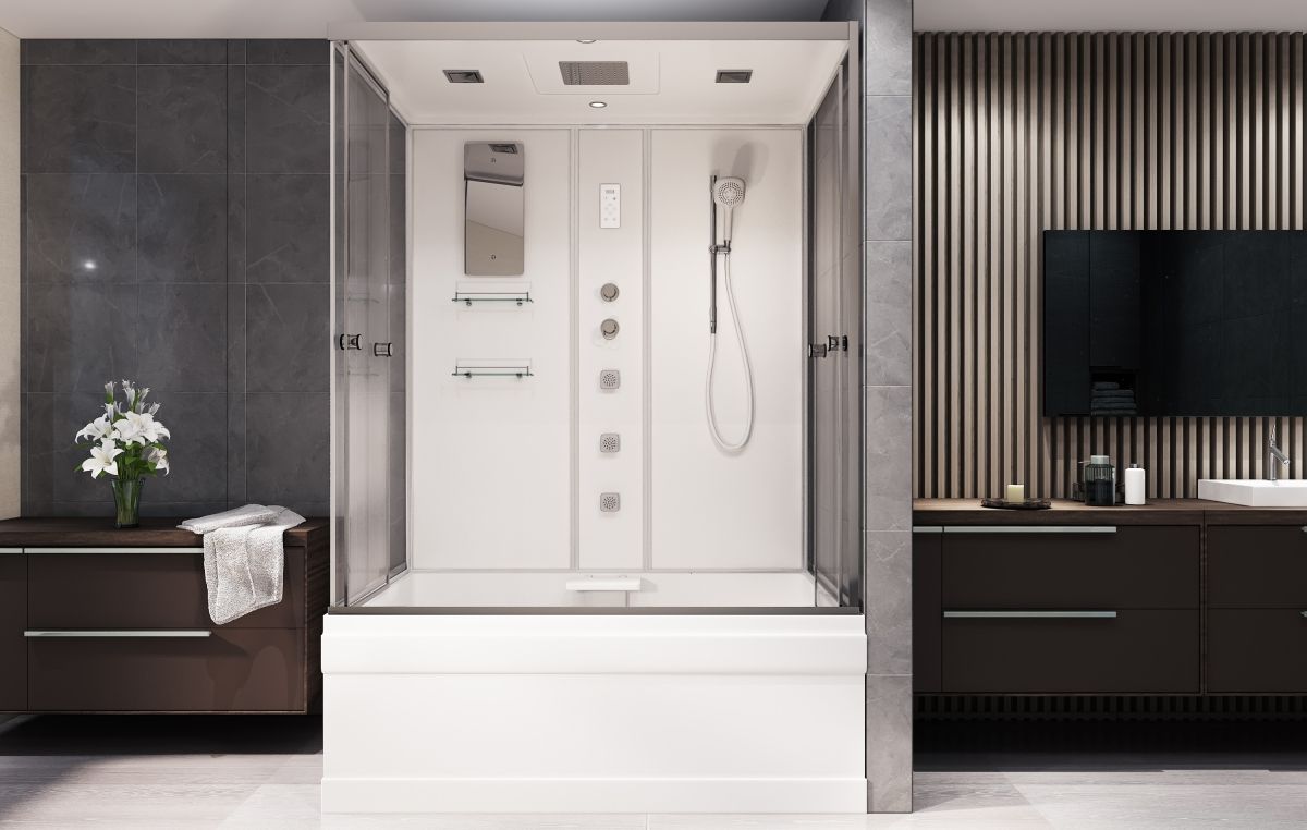 Стильная душевая кабина с внутренней сборкой AvaCan V160 сочетает в себе высокую функциональность, практичность и надежность. Для изготовления применяют безопасное закаленное стекло толщиной 5 мм, надежно фиксируемое алюминиевым профилем. Цвет профиля хром. В комплекте зеркало, сенсорный пульт управления, передний съемный экран, донный клапан (клик-клак), душевой гарнитур, тропический (верхний) душ, откидное сиденье, гидромассажные форсунки, смеситель, переключатель режимов, вентиляция, радио.