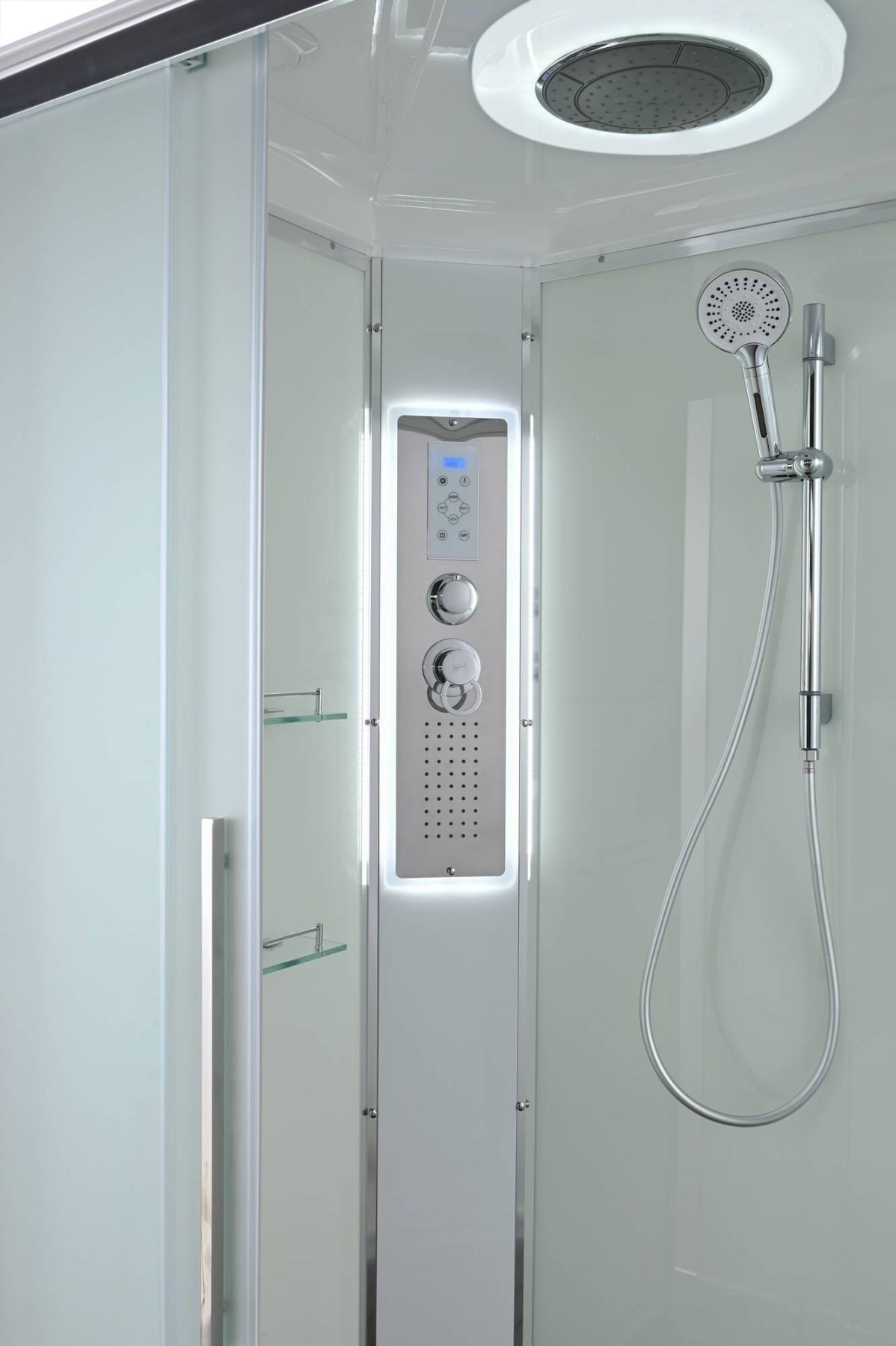 Стильная душевая кабина AvaCan сочетает в себе высокую функциональность, практичность и надежность. При изготовлении применяется безопасное закаленное стекло, надежно фиксируемое алюминиевым профилем.Профиль сделан из алюминия повышенной прочности. Сборка без силикона (увеличивает срок службы, защищает от протечек), внутренняя сборка (облегчает установку и ревизию; позволяет установить в ограниченном пространстве и обойтись без демонтажа других сантехнических приборов), смеситель резьбовой (без хомутов). Съемный экран поддона (позволяет осуществлять подключение и ревизию сифона).Двойные металлические ролики дверей (распределение нагрузки на два ролика, увеличивают срок службы). Душевая штанга(позволяет регулировать по высоте ручную лейку), ручная арома-лейка с витамином С (картридж в комплекте,есть возможность замены или удаления картриджа), полочки(из стекла, с ограничителем), сифон с гидрозатвором, сенсорный пульт управления с функциями: блютуз, LED подсветка, радио, вытяжка, гидромассаж спины, тропический (верхний) душ.