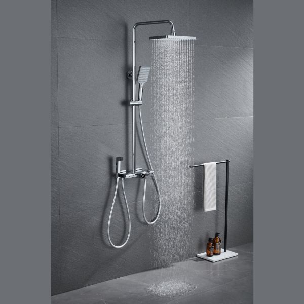 Из потребителей на системе установлен ручной режимный и верхний душ, а также излив скрытой установки и гигиенический душ. Выбор потока осуществляется через клавиши расположенные сверху корпуса смесителя.