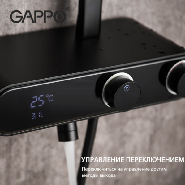 Черная душевая система со смесителем полкой Gappo G2495, смеситель из латуни. Тропический душ системы и ручной душ изготовлены из ABS-пластика со системой легкой очистки от известкового камня.