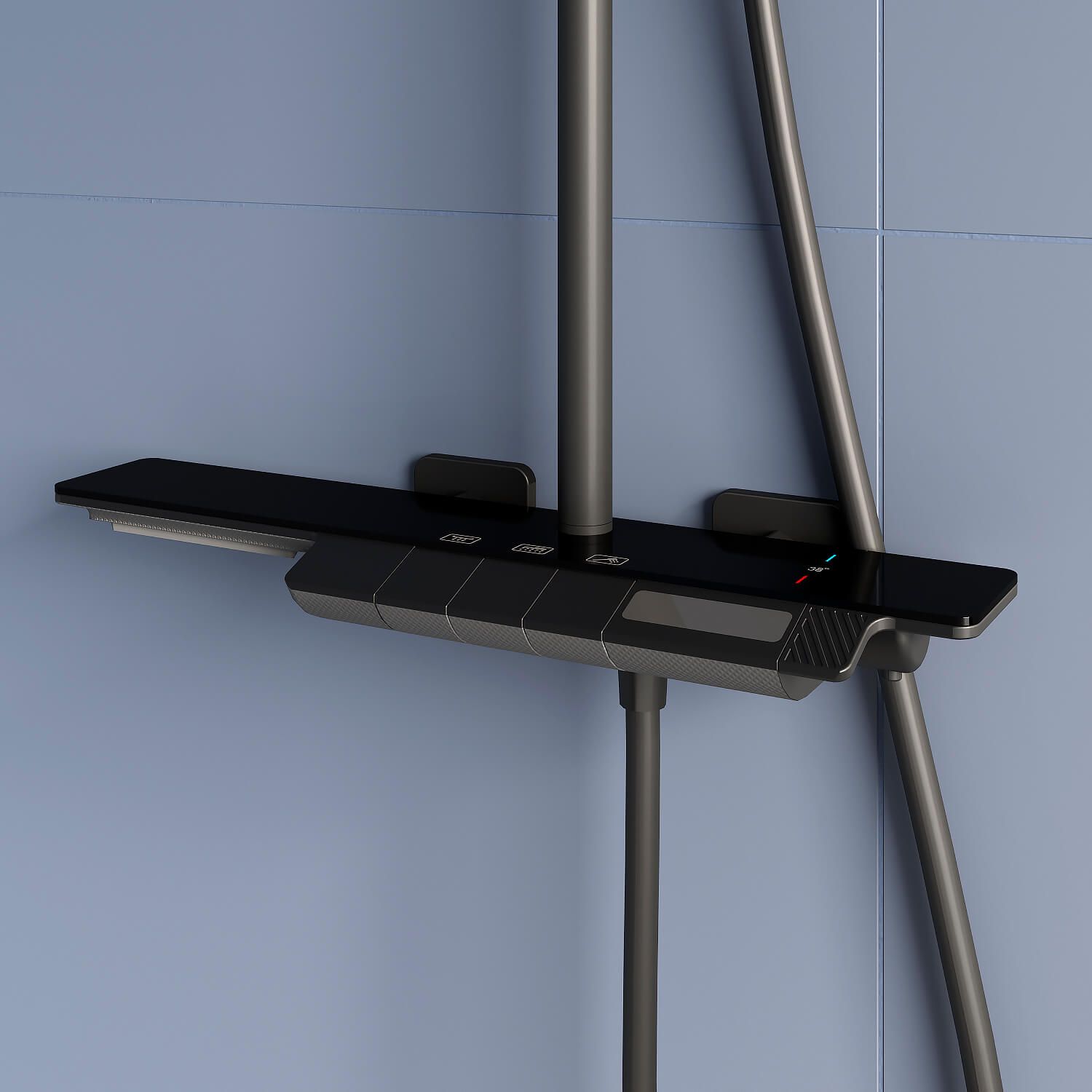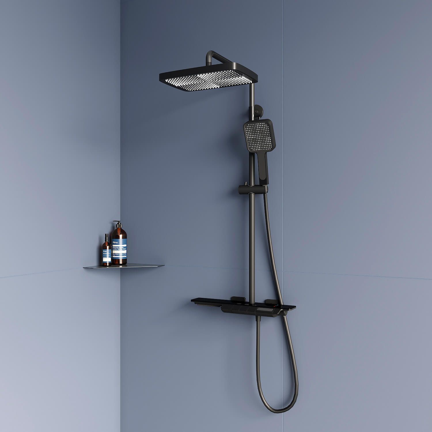 - Вместительная стеклянная полка для душевых принадлежностей;