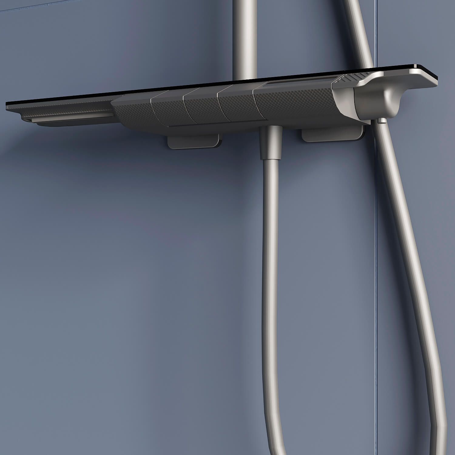 - Вместительная стеклянная полка для душевых принадлежностей;