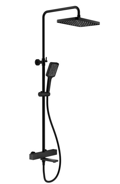 Душевая система с термостатом Splenka S224.26.06, черный. Управление: термостат. Механизм: термостатический картридж. Стандарт подводки: G 1/2. Размер верхнего душа (ШхД): 320х210 мм. Количество режимов струи ручного душа: 3. Регулируемая душевая штанга: 1160-1560 мм. Монтаж: на стену. Излив - функция переключения.