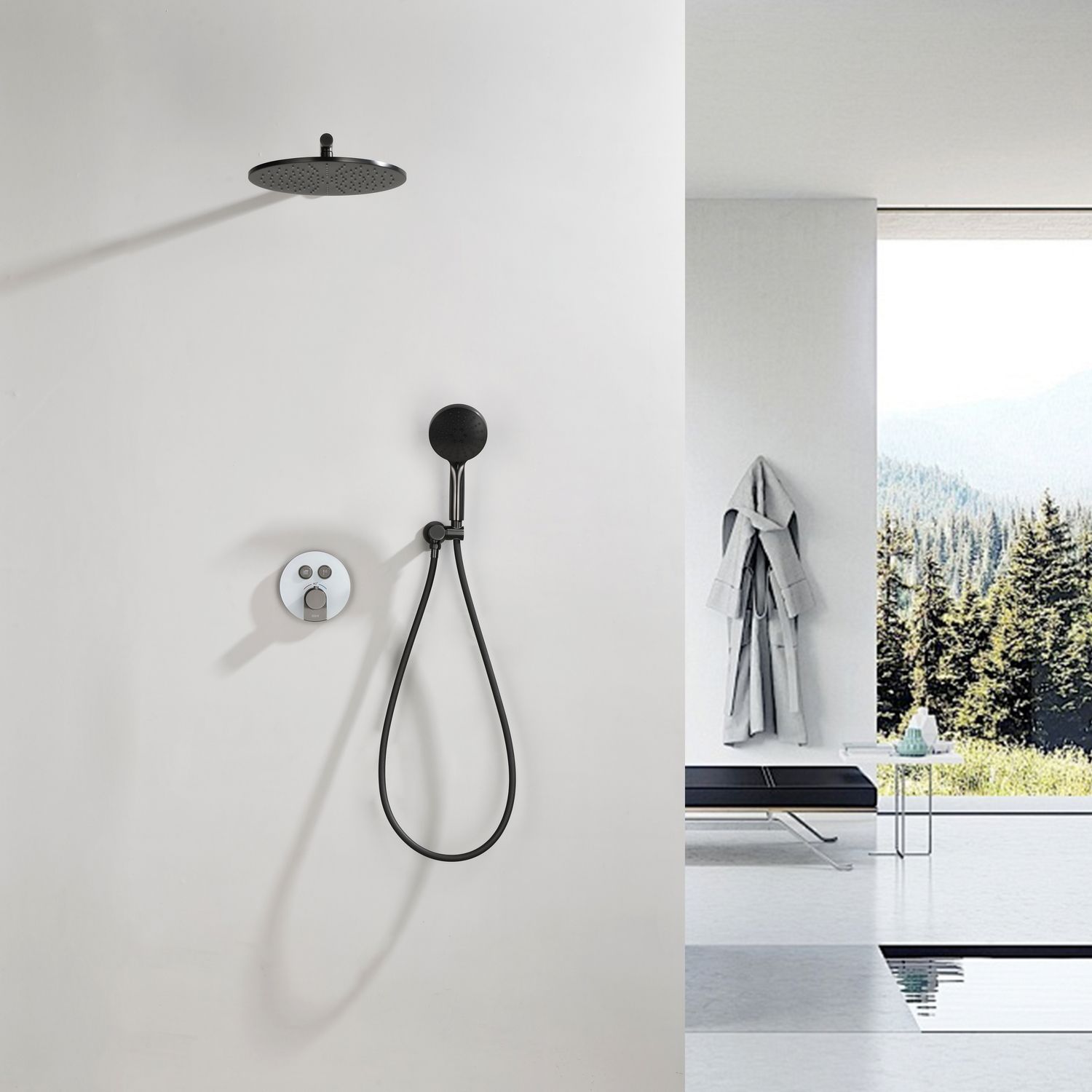 Комплект скрытого монтажа для душа датского производителя Black&White в цвете оружейная сталь. Корпус изделия выполнен в форме диска, в который интегрирован термостатический картридж прогрессивного типа для настройки температуры с постоянным давлением, а также кнопочный дивертор для выбора нужного потребителя. В комплектацию входит верхний душ на кронштейне цилиндрической формы и ручная лейка с режимами. Скрытая часть также входит в комплектацию данного изделия.
