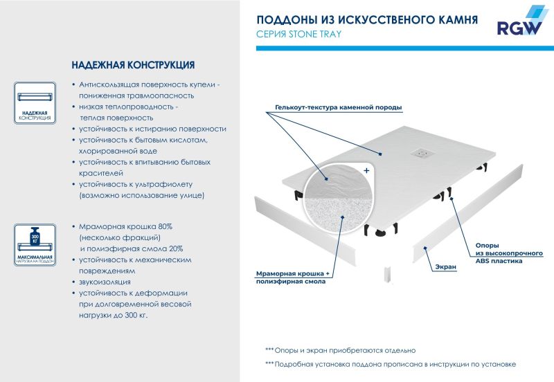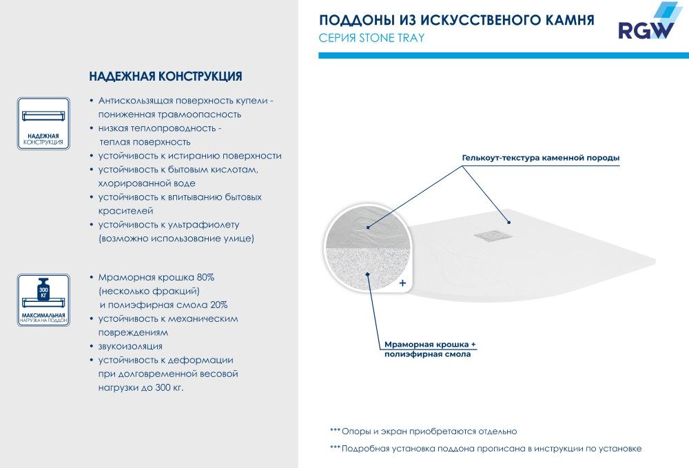 Душевые поддоны RGW ST с фактурой под сланцевый камень.Меняем представление о текстуре «искусственный камень»!В серии душевых поддонов Stone Tray появилась новинка привлекательной полукруглой формы в роскошном белом цвете и двух форматах. При необходимости мы можем выполнить обрезку изделия по индивидуальному размеру.Полукруг - идеальное решение для компактной ванной комнаты и позволит по максимум использовать полезное пространство, например, для мебели или бытовой техники.Визуальные акценты и форма поддона - новые, а качество прежнее: рельефная антискользящая поверхность в сочетании с низкой теплопроводностью материала создает ощущение нагретого солнцем камня под вашими ступнями и выводит обычный прием душа на новый уровень комфорта.Высокотехнологичный материал - 80% мраморной крошки плюс полиэфирные смолы - обеспечивает беспрецедентную устойчивость к механическим, химическим и другим видам повреждений, а также выдерживает долговременную весовую нагрузку до 300 кг.Добавьте сюда низкий уровень шума воды, когда вы принимаете душ для ещё большего удовольствия.Новый поддон — это самостоятельный аксессуар вашей душевой. Универсальный цвет, откликающийся на уровень освещения, и текстура “под камень” идеально сочетаются с интерьерами от смелых лофт и хайтек до романтичного прованса, а решетка из нержавеющей стали, защищающая слив, создаст безупречный аккомпанемент душевым системам, а таком же оттенке.Обратите внимание: фактические размеры с учетом заполнения швов могут меняться в пределах -8/+2 мм.По вашему желанию можем установить поддон на ножки:
