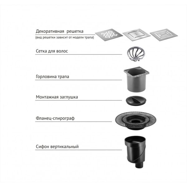 Решетка толщина 3мм, нержавеющая сталь AISI 304Горловина трапа, пластикФланец трапа с переходником, РРМонтажная заглушка, PPСамопромывной S-образный сифон PP:Вертикальный выпуск, пропускная способность 48л/мин, монтаж 360°Монтажный ключ, пластик