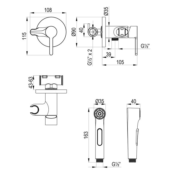 - Аксессуары в комплекте: лейка гигиенического душа с нажимным механизмом, душевой шланг 1,2 м