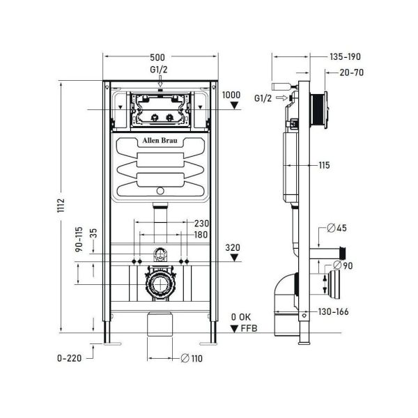 Инсталляция Allen Brau Pneumatic, для подвесного унитаза, без кнопки, 9.11100.20Размер: 1112х115х500 мм