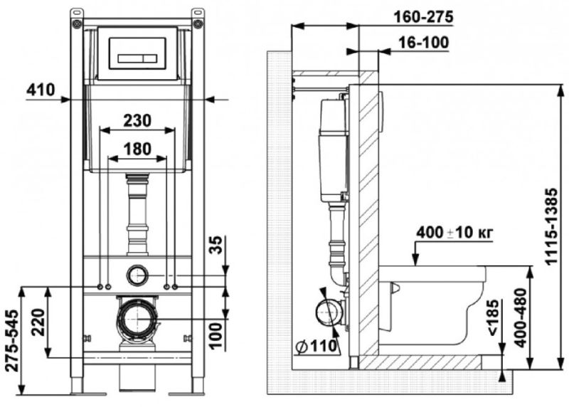 Межосевое расстояние под шпильки для подвеса унитаза 18 и 23 см.