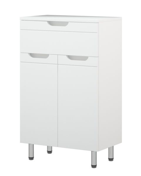 Комод Corozo Лея, 50 см, белый, SD-00001510Коллекция мебели для ванных комнат "ЛЕЯ" создана для тех, кто ценит простоту форм, сочетание округлых и прямых линий, удобство эксплуатации. У мебели коллекции «ЛЕЯ» корпус выполнен из ЛДСП, фасады - из влагостойкой плиты МДФ, покрытие – пленка ПВХ. Мебель оснащена доводчиками. Комод представлен в напольном варианте исполнения на четырех металлических опорах. У модели один выдвижной ящик высотой 110 мм и две распашные створки снизу. За створками одна регулируемая по высоте вкладная полка. Фурнитура с лицевой стороны фасадов отсутствует, вместо нее предусмотрены интегрированные ручки с декоративной полосой тонкой фрезеровки. Бесшумность и долговечность эксплуатации обеспечивают надёжные системы мягкого закрывания – роликовые направляющие и петли с доводчиками.