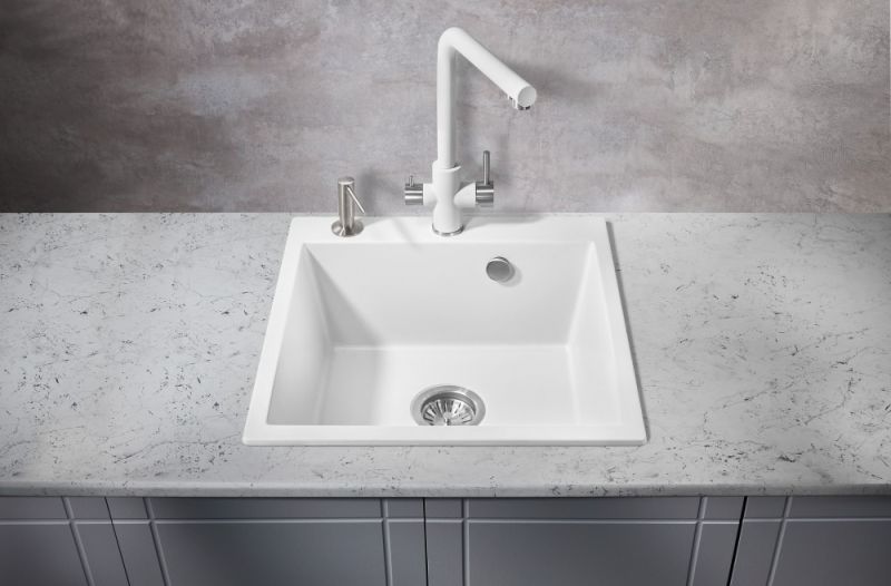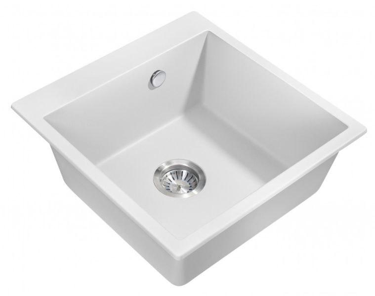 Врезная каменная прямоугольная мойка для кухни MILACIO Murcia 51 Cuarzo (MC.77022), выполненная в белом матовом цвете, станет украшением любой кухни — как классического, так и современного стиля. Раковина изготовлена из искусственного камня — кварца, или кварцевого композита, — твердого, долговечного материала, устойчивого перед любыми химическими веществами, экстремальными температурами и повреждениями. Имеет одну глубокую вместительную чашу квадратной формы, благодаря чему очень удобна в эксплуатации. Водоотталкивающее покрытие не дает каплям растекаться по поверхности, сводя к минимуму уровень загрязнения. А шумоподавляющие свойства материала не позволяют мойке греметь при наполнении водой и мытье посуды. Компактный сифон с выпуском и переливом сохранит много полезного места в тумбе под раковиной.