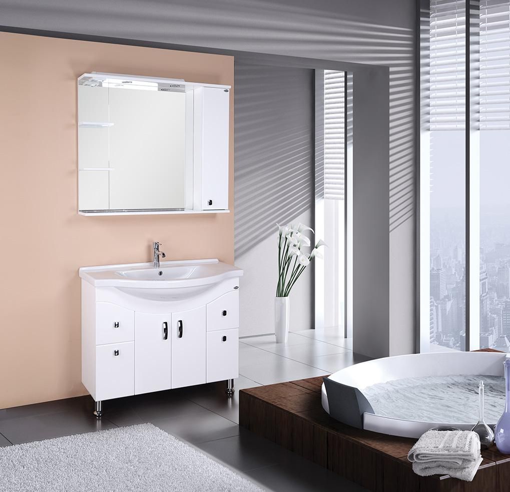 В тумбе Onika Эльбрус 90 белоснежный глянец фасада подчеркивается оригинальной хромированной фурнитурой и сложной изысканной геометрией линий.