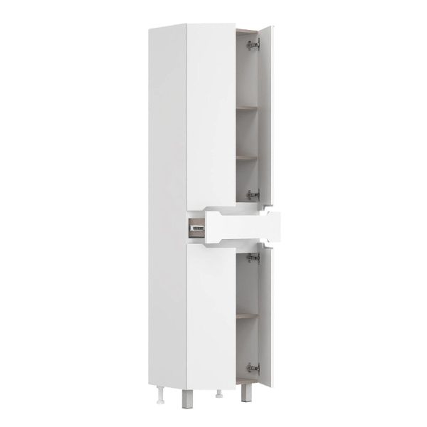Пенал имеет два отделения за распашными дверцами с доводчиками, полки внутри регулируются по высоте. Ящик посередине имеет надежные направляющие полного выдвижения. Ручки, изящно интегрированные в фасады, позволяют сделать эксплуатацию мебели более удобной и практичной.