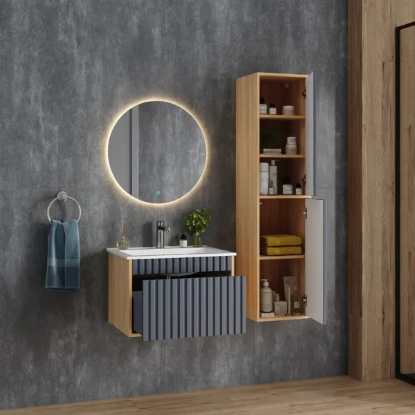 Рифленый серый матовый фасад с покрытием SoftTouch и корпус цвета дуба с роскошной текстурой подчеркнет изысканный вкус владельца и станет центральным элементом декора.