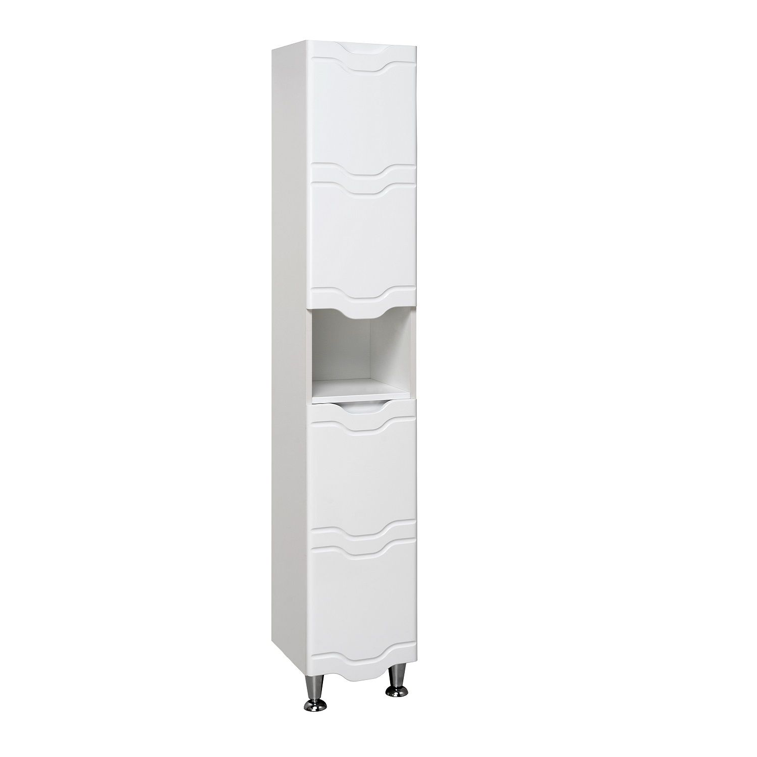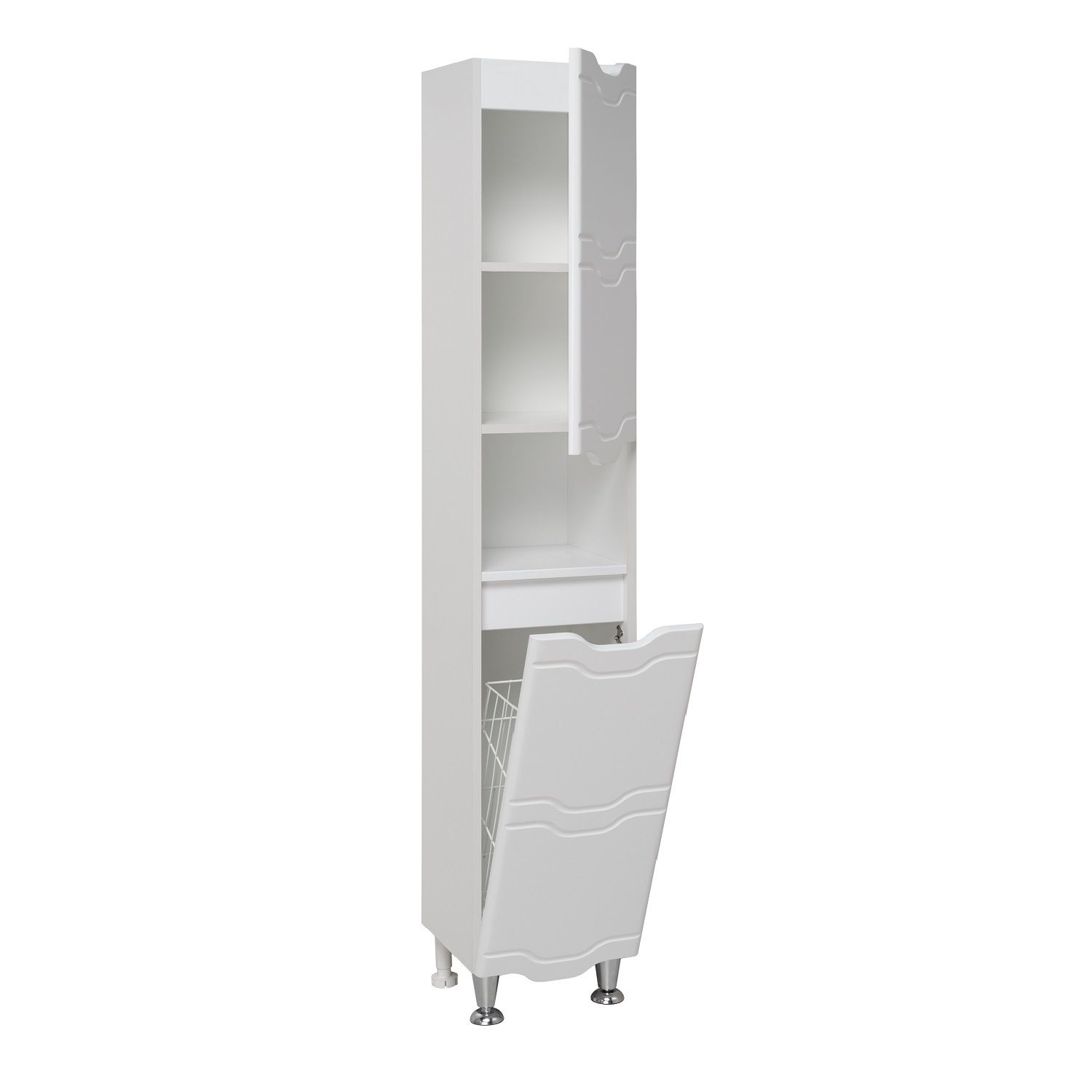 Шкаф-колонна напольный с двумя распашными дверками и открытой нишей посередине. В верхнем отделении - одна внутренняя полка, нижнее отделение комплектуется полкой и корзиной для белья. Петли со встроенным доводчиком, ножки хром - 2шт, ножки пластик -2шт. Выпускается только в правом исполнении.