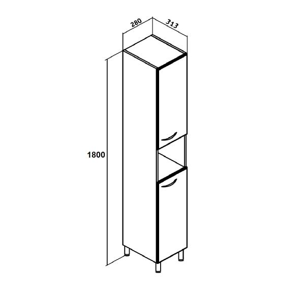 Шкаф-колонна напольный с двумя распашными дверками и открытой нишей посередине. В нижнем и верхнем отделениях - по одной полке. Петли со встроенным доводчиком, ручки - 2шт, ножки хром - 2 шт, ножки пластик -2шт. Универсальный.