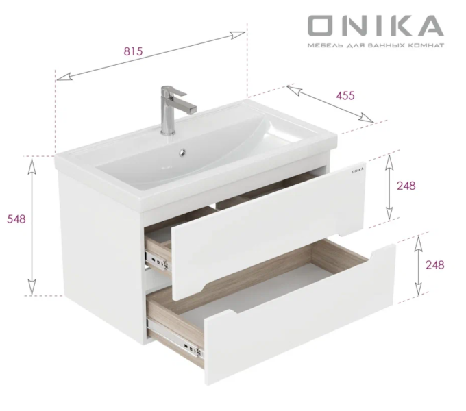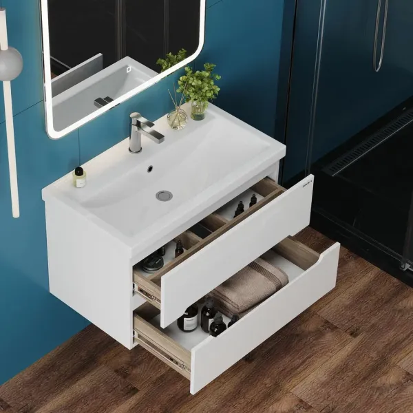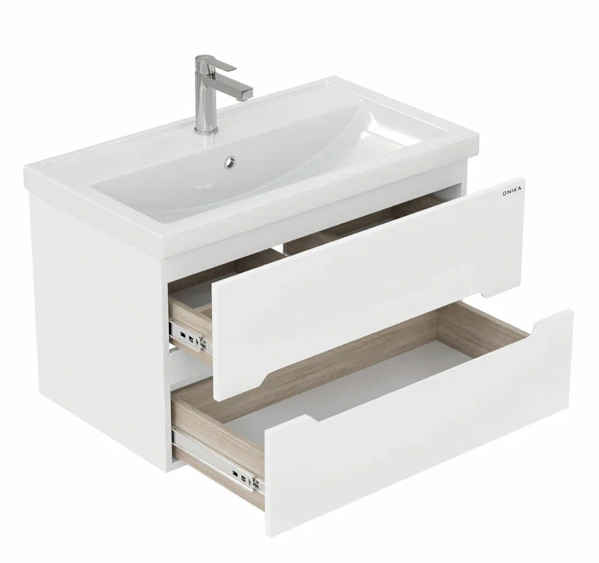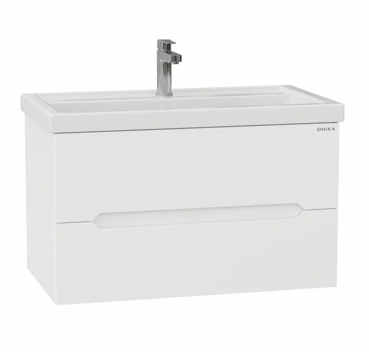 Подвесная тумба под раковину Onika Айленд 80 сочетает в себе стильный минималистичный дизайн, белую глянцевую поверхность и высочайшее качество исполнения.