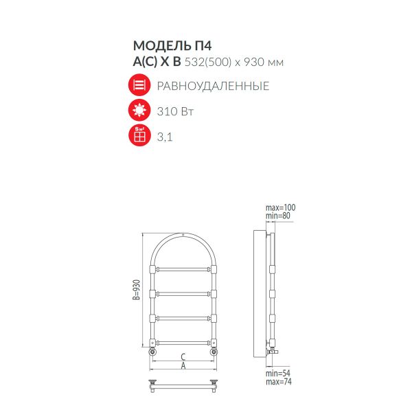 Равномерный нагрев: 4 секции общей мощностью 310 Вт создают оптимальную конвекцию, мягко прогревая помещение и исключая перепады температур.