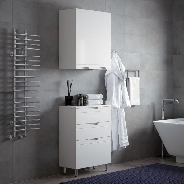 Шкаф Corozo Лея, 55 см, цвет белый, SD-00000397Коллекция мебели для ванных комнат "ЛЕЯ" создана для тех, кто ценит простоту форм, сочетание округлых и прямых линий, удобство эксплуатации. У мебели коллекции «ЛЕЯ» корпус выполнен из ЛДСП, фасады - из влагостойкой плиты МДФ, покрытие – пленка ПВХ. В верхней части стойки расположены полки, в нижней части - высокие боковины. Фурнитура с лицевой стороны фасадов отсутствует, вместо нее предусмотрены интегрированные ручки с декоративной полосой тонкой фрезеровки.