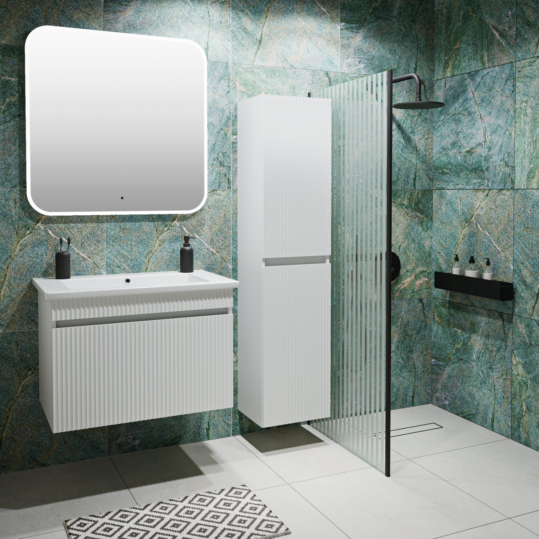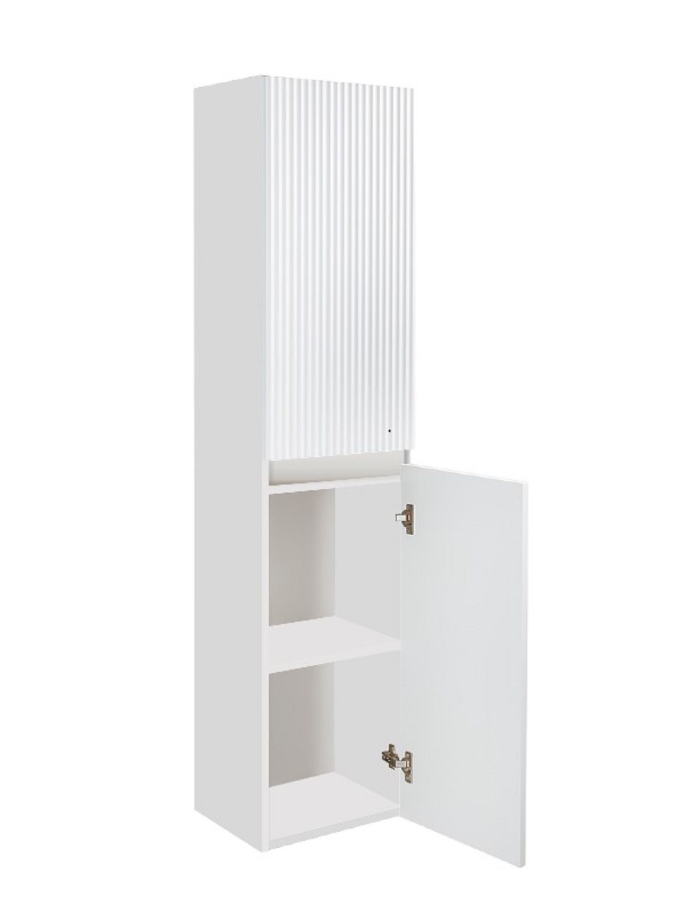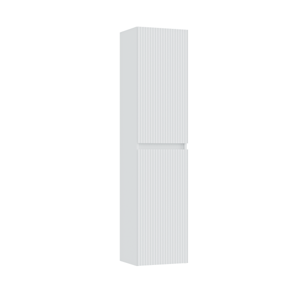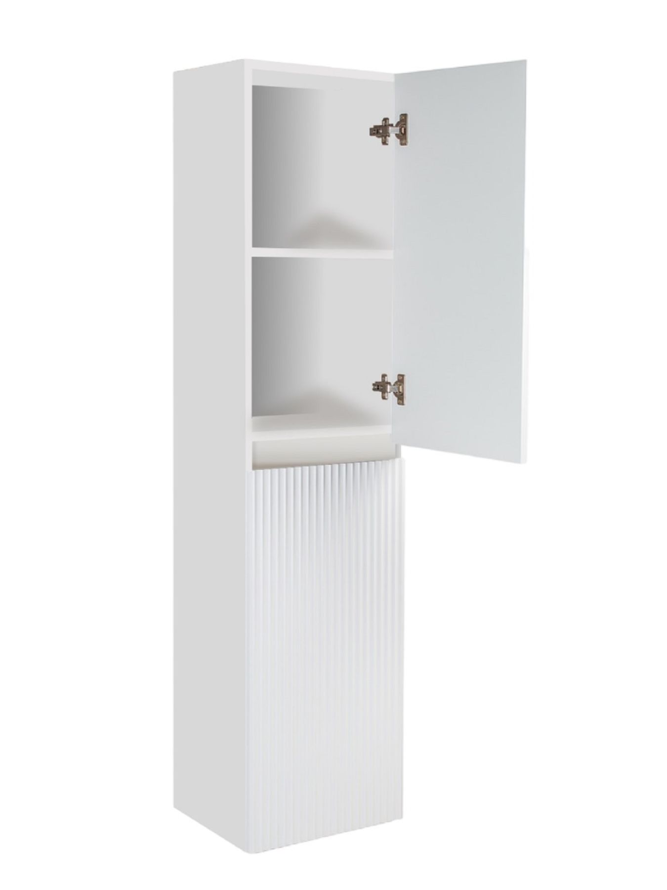 Шкаф пенал для ванной комнаты RUNO МОДЕНА (подвесной) – это изысканность и утончённая роскошь в интерьере. Волнистые рифленые фасады визуально «оживляют» и «приводят в движение» всю обстановку комнаты, сохраняя при этом умиротворение и покой. Цвет корпуса и фасада классический – белый глянец, идеально впишутся в любой интерьер ванной комнаты. Шкаф в ванную комнату оснащён двумя распашными дверцами, в каждом отделении по одной встроенной полке. Каждая дверца укомплектована двумя петлями, верхняя с доводчиком, нижняя без доводчика. Мебель для ванной RUNO - красота и практичность в мелочах, шкаф пенал для ванной комнаты Модена – лучший выбор для Вашей ванной комнаты!