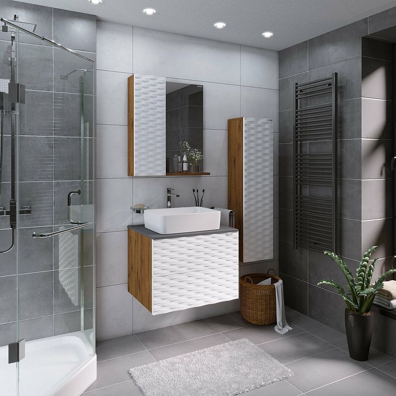 Шкаф-зеркало Альба 65 см отражает современные тенденции в дизайне мебели для ванных комнат: белый матовый цвет с 3D рисунком безупречно сочетается с текстурой под дерево , отсутствие лишних деталей.