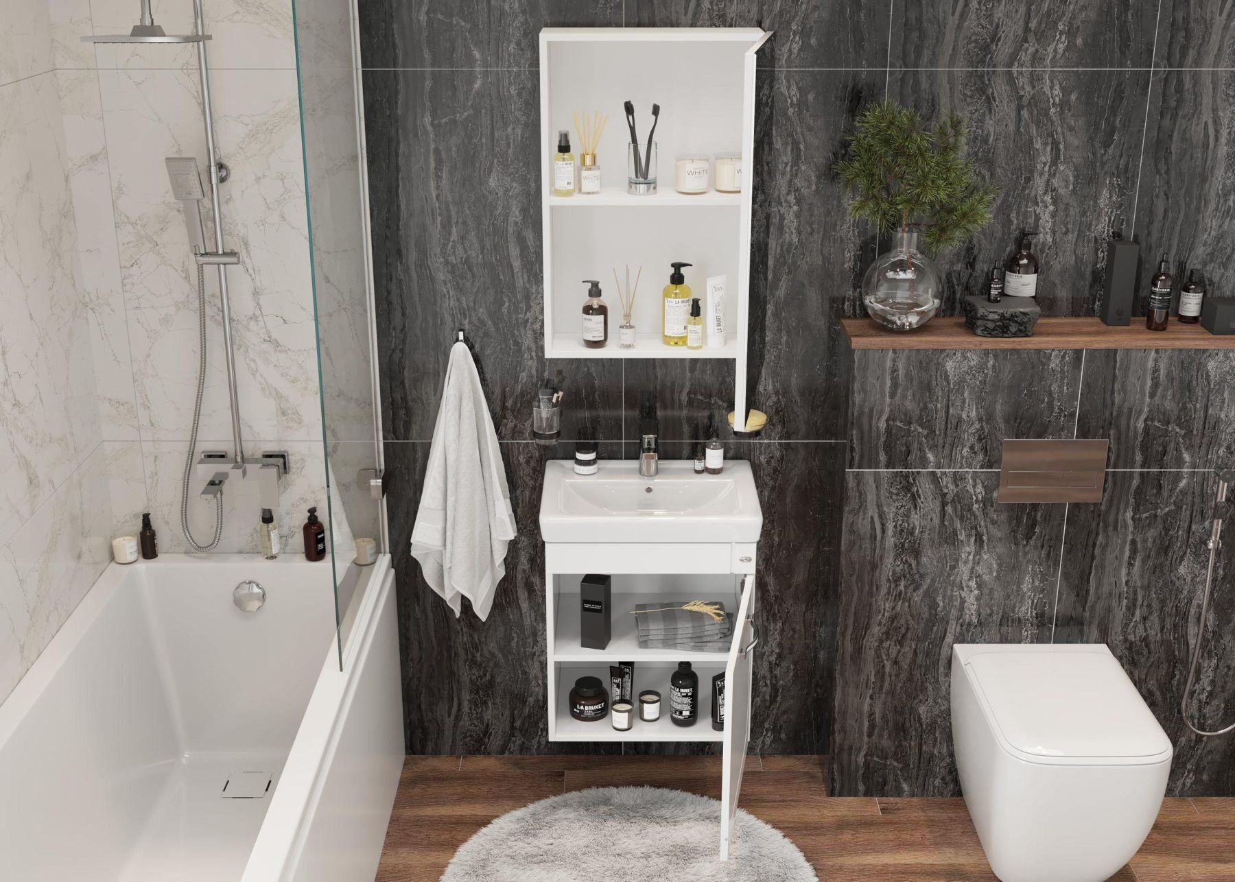Простая прямоугольная форма, полное отсутствие декора и зеркальный фасад - идеальное решение для дизайна ванной комнаты в аскетичном стиле.