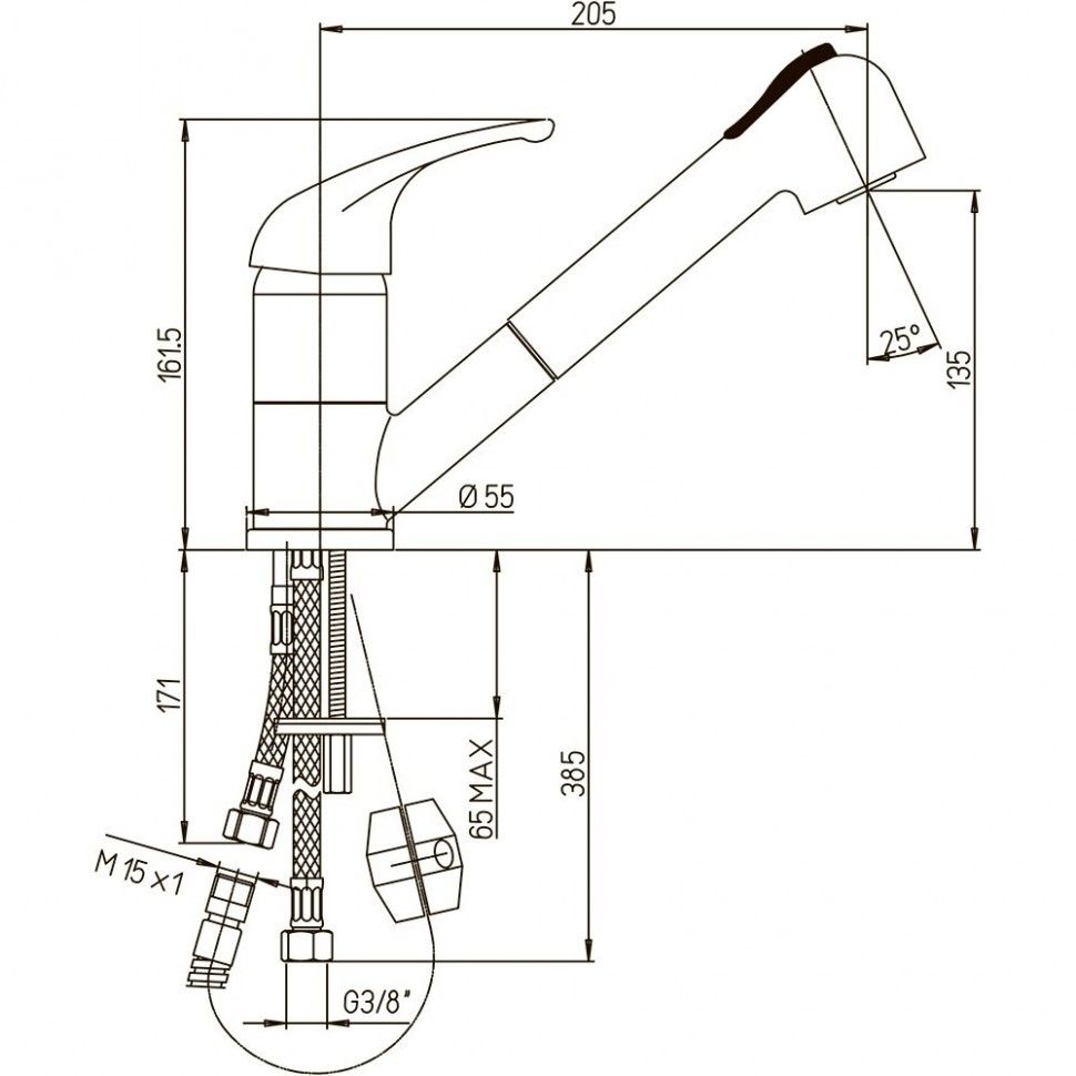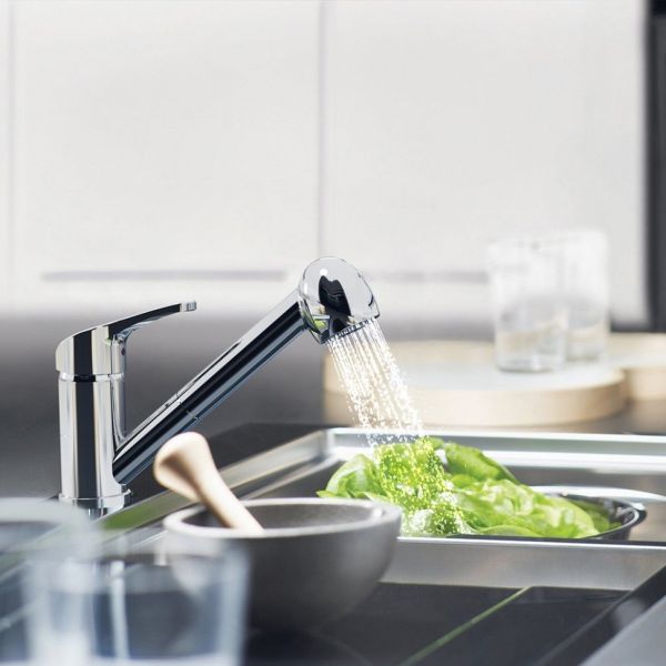 - Выдвижная лейка с несколькими режимами подачи воды, управление на корпусе лейки.