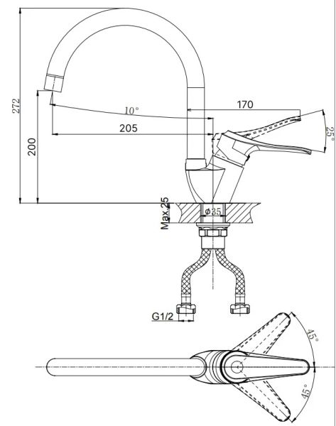 Смеситель для кухни RUSH арт. JA0735-22 с поворотным изливом из коллекции Jawa с металлической ручкой, изготовлен из высококачественной латуни и имеет рычажное управление.В смеситель установлен картридж D-35 с керамическими пластинами. Высота смесителя 272 мм. Излив поворотный 224 мм. Высота излива до аэратора 157 мм. Аэратор изготовлен из пластика с нержавеющим корпусом, угол наклона - 10 гр. В комплекте универсальная присоединительная группа для установки на горизонтальную поверхность, гибкая подводка с латунными гайками 40 см - 2шт, фум-лента, индивидуальный пакет, паспорт, гарантийный талон.