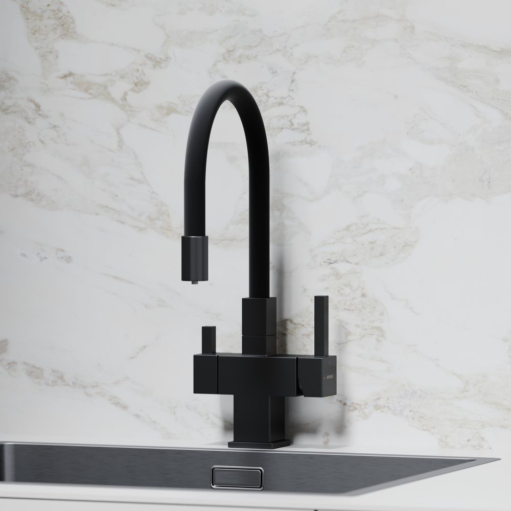 Смеситель для кухни SANCOS Arno с гибким изливом и возможностью подключения фильтра для воды, цвет матовый черный, арт. SC4005MBФункция "Холодный старт" - при включении смесителя активируется холодной поток, для экономии горячей водыАэратор, гибкая подводка, ключ и крепления для монтажа