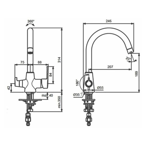 - поворотный излив 207 мм, угол поворота 360?