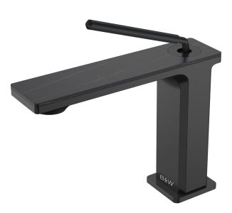 Смеситель для раковины датского производителя Black&White в черном матовом цвете. Корпус изготовлен из сантехнической латуни марки HPB 59– безопасного для здоровья сплава с высоким ресурсом. Управление потоком и настройка температуры воды происходит с помощью керамического картриджа повышенной пропускной способности, а на выходе для уменьшения разбрызгивания и экономии воды установлен аэратор. Важная стилистическая особенность —  накладка на излив изготовленная из керамогранита с текстурой  и рисунком черного мрамора. В формах продукта пересекаются цилиндрические и прямоугольные формы, что  гармонично может дополнить концепцию ванной комнаты в экостиле.