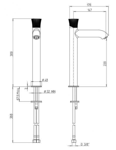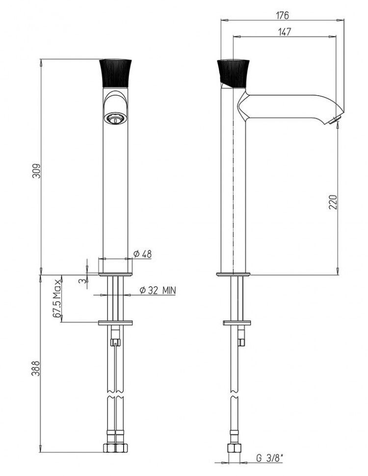 • Увеличенная высота корпуса смесителя позволяет использовать его с накладными раковинами и раковинами-чашами.