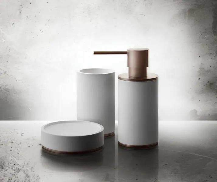 Белая верхняя часть из износостойкого полимера легко очищается и устойчива к влаге, а нижняя часть с матовой металлической отделкой придаёт изделию вес и устойчивость на поверхности. Оттенок тёплой бронзы создаёт мягкий акцент и гармонирует с элементами аналогичной отделки.