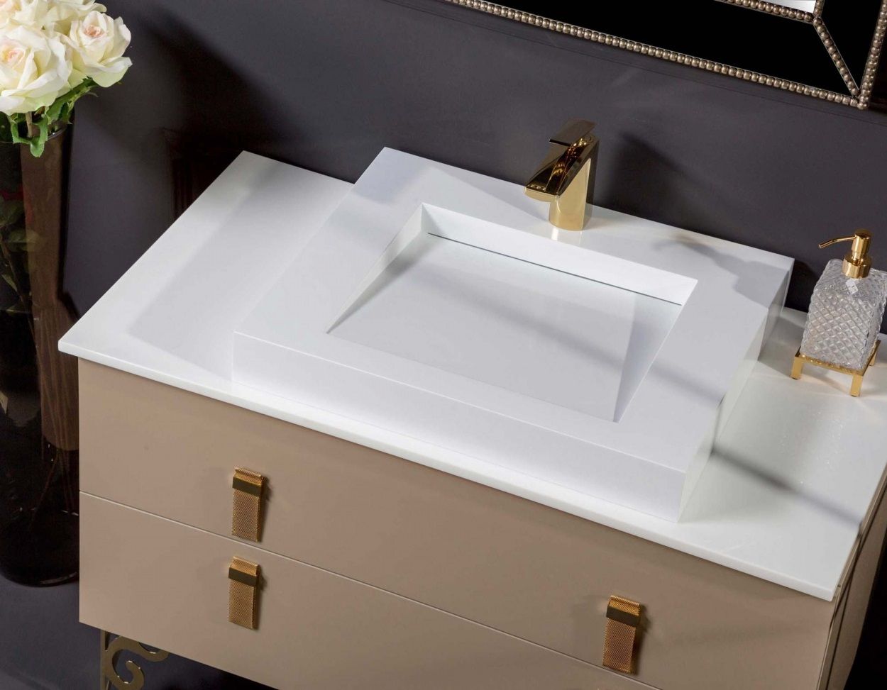 Столешница изготовлена из инновационного материала Solid Glass, в состав которого входит мраморная крошка и стекло. Материал черезвычайно прочен, не оставляет следов царапин и обладает неповторимой глубиной белого цвета.