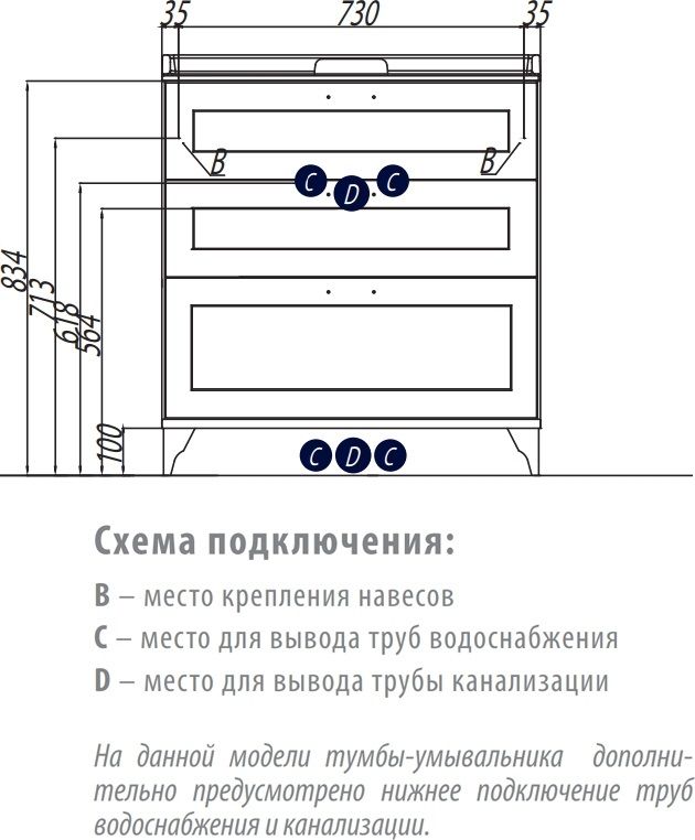 • В тумбе предусмотрена возможность не только заднего, но и нижнего подключения труб водоснабжения и канализации, что значительно упрощает её установку