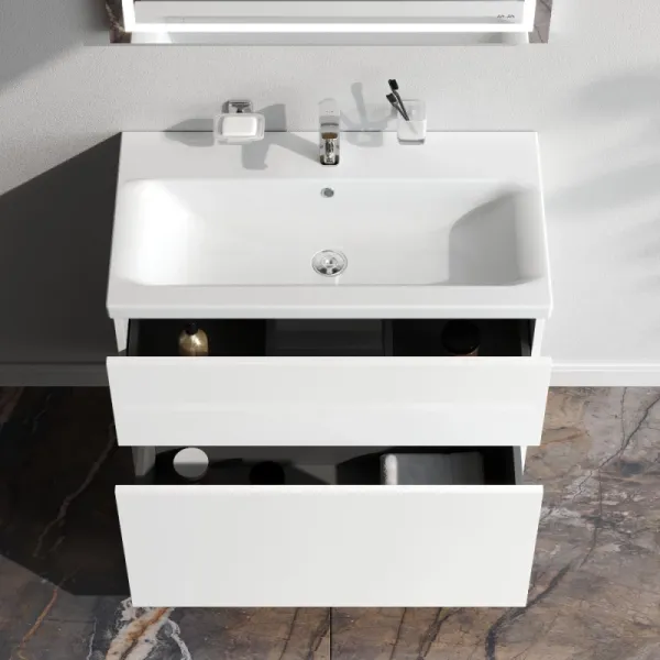 Тумба под раковину Am.Pm Gem M90FSX0802WG белый 80 см Тумба под раковину Am.Pm Gem 80 M90FSX0802WG напольная, белый, глянец. 2 ящика (внутри в цвете антрацит с антискользящим эффектом). В верхнем ящике органайзер для хранения гигиенических принадлежностей. Фурнитура push-to-open - открытие ящика легким нажатием на фасад. Направляющие скрытого монтажа обеспечивают плавное выдвижение ящиков. Комплектация: тумба под раковину, комплект ножек, инструкция