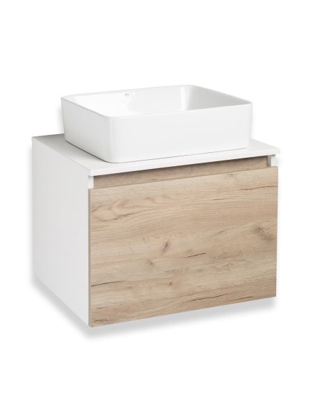 Тумба под раковину в ванную RUNO БАРИ (подвесная) - безупречное сочетание модных тенденций с классическим оформлением ванной комнаты. Тумба под раковину БАРИ оснащена выдвижным ящиком на шариковых направляющих, с системой плавного закрывания. Цвет корпуса классический - белый, при этом цвет фасада в модном цвете – крафтовый дуб, идеально впишутся в любой интерьер ванной комнаты. К тумбе для ванной подойдут умывальники на столешницу: «OVALE 50» (50х36см) - идеальное решение для стильного интерьера ванной, создан для минималистичных интерьеров и подойдёт для санузлов в стиле лофт, минимализм и хай-тек. Строгая овальная геометрически правильная форма раковины, усиливает идею лаконичности в дизайне, устанавливается на столешницу, накладным методом. «PALLA D41» (диаметр 41см) - идеальное решение для стильного интерьера ванной, создан для минималистичных интерьеров и подойдёт для санузлов в стиле лофт, минимализм и хай-тек. Строгая круглая геометрически правильная форма раковины, усиливает идею лаконичности в дизайне, устанавливается на столешницу, накладным методом. «TRE 48» (48х37см) - идеальное решение для стильного интерьера ванной, создан для минималистичных интерьеров и подойдёт для санузлов в стиле лофт, минимализм и Хай-Тек. Строгая прямоугольная форма с округлыми углами усиливает идею лаконичности в дизайне, устанавливается на столешницу, накладным методом. «TERZO 60» (59х39см) - идеальное решение для стильного интерьера ванной, создан для минималистичных интерьеров и подойдёт для санузлов в стиле лофт, минимализм и хай-тек. Асимметричная раковина, которую можно установить любой стороной, дизайнерское решение для нестандартных интерьеров, усиливает идею лаконичности в дизайне, устанавливается на столешницу, накладным методом.