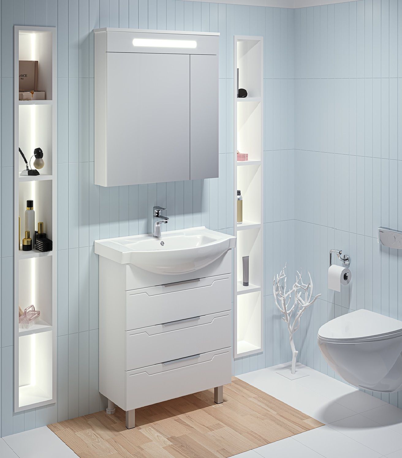 Тумба под умывальник напольная с тремя выдвижными ящиками на шариковых направляющих полного выдвижения. Ручки профильные - 3шт, ножки хром - 2шт, ножки пластик - 2шт.