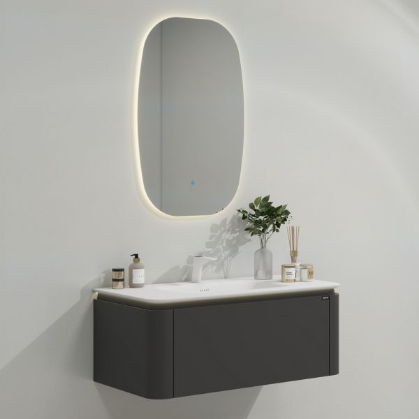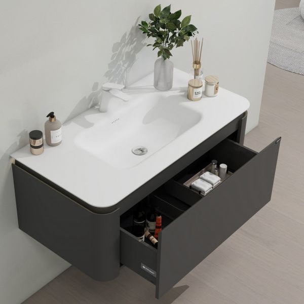 Тумба с раковиной для ванной комнаты датского производителя Black&White в габаритных размерах 100x52x40 см.Данная версия является продолжением линейки U 925 в сером цвете. Раковина — столешница изготовлена из не пористого искусственного камня Corian, который тактильно ощущается как soft touch материал, он легок и прост в уборке,а слив оборудован донным клапаном хромированного цвета. База производится из влагостойкой  девятислойной фанеры и покрыта эмалью для долгосрочного сохранения материала.Важной особенностью является контурная диодная подсветка, которая расположена по периметру столешницы.На тумбе предусмотрен один выдвижной ящик, оборудованный фурнитурой UniHopper с доводчиками.Коллекция U 935– эргономичный и продуманный продукт,который наполнит Вашу ванную комнату уютом, а плавные и утонченные формы впишутся в любые современные интерьеры.