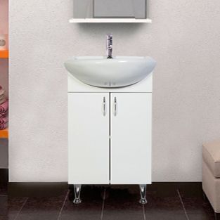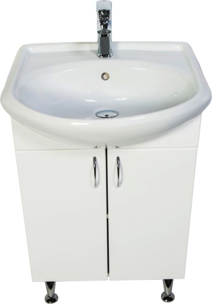 Напольная тумба с раковиной. Дверки c механизмом доводчика, обеспечивающим плавное закрывание. Фасад МДФ в пленке, цвет белый глянец. Корпус ЛДСП - белый глянец. Раковина - фарфор. Фурнитура в цвете хром. В комплекте н-р ножек и внутренняя полочка. Зеркальный шкаф для комплекта (арт. LA-50TUW+RA) приобретается дополнительно.