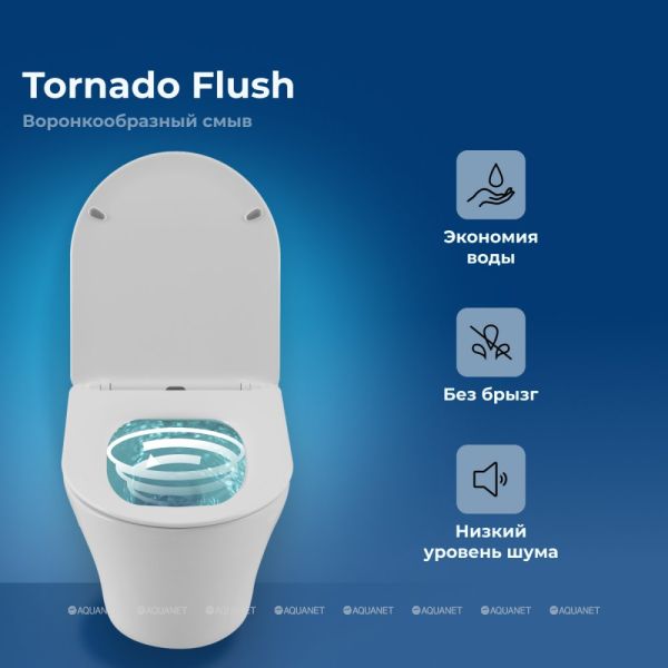 Tornado Flush современный воронкообразный вид смыва, который позволяет обработать до 95% поверхности чаши унитаза. система смыва Tornado Flush работает по принципу: струи воды из отверстий в чаше создают эффект водоворота, что позволяет полностью очищать всю внутреннюю поверхность унитаза. унитаз с системой Tornado Flush обладает массой преимуществ, таких как: