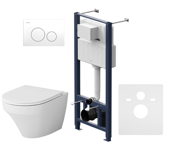 Полностью готовый к установке комплект: система инсталляции с клавишей, подвесной унитаз сиденьем.Не разборная рама из стального профиля выдерживает нагрузку до