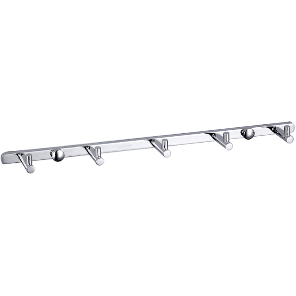 Крючки расположены на оптимальном расстоянии друг от друга для удобного использования. Устанавливается на стену посредством шурупов или саморезов. Стойкое хромированное покрытие защищает изделие от влаги и придает ему блестящий вид.