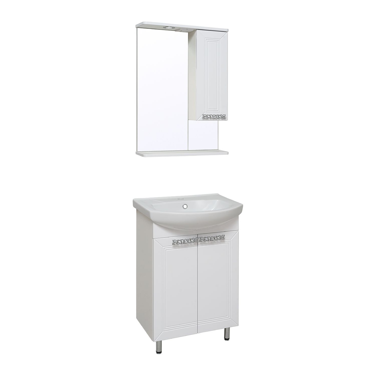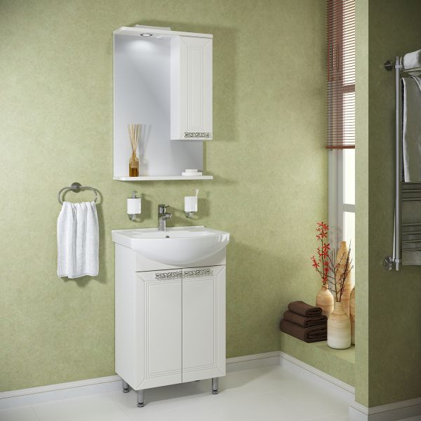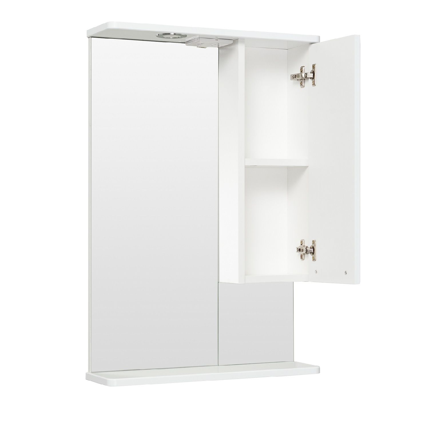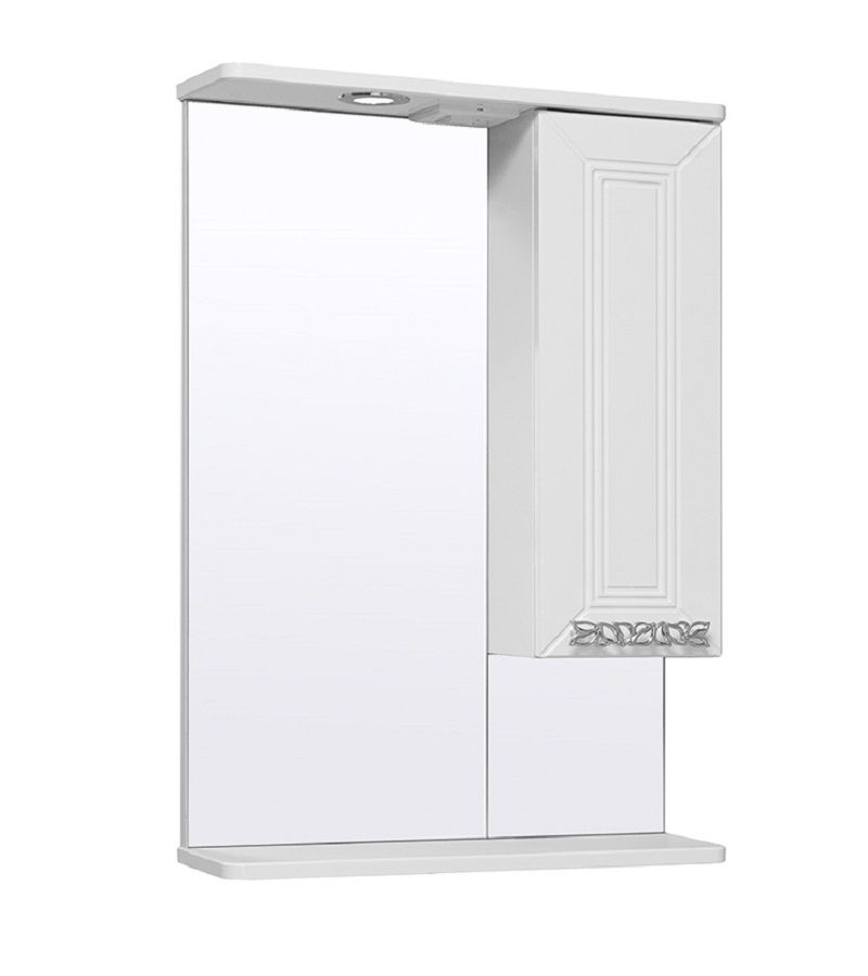 Зеркальный шкаф оборудован одним врезным светодиодным светильником 220В и розеткой с выключателем. Справа - шкафчик с распашной дверцей и одной внутренней полкой. Под зеркалом - нижняя полка. Петли со встроенным доводчиком, ручка - 1шт. Выпускается только в правом исполнении.
