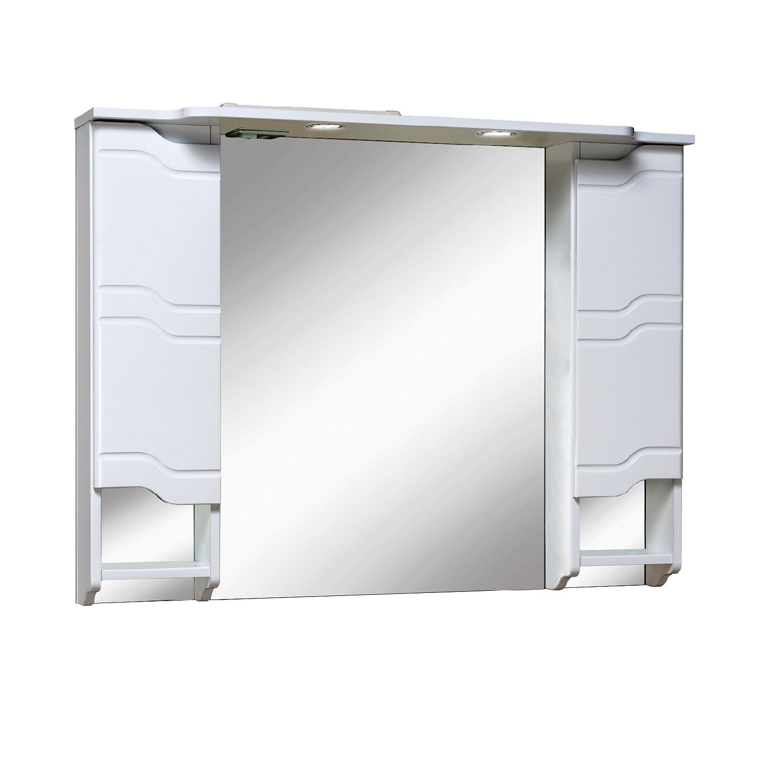 Зеркальный шкаф оборудован двумя врезными светодиодными светильниками 220В и розеткой с выключателем. Справа и слева - шкафчики с распашными дверками и одной внутренней полкой в каждом. Под шкафчиками - открытые полочки. Петли со встроенным доводчиком.