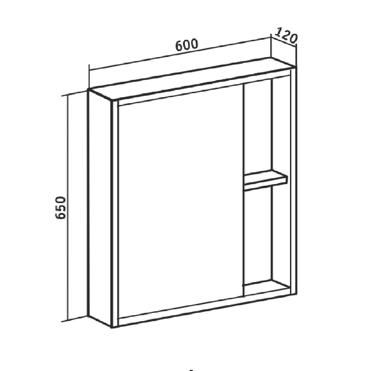 Зеркальный шкаф без подсветки с одной распашной дверкой и открытыми полками (слева или справа, зависит от установки). Внутри шкафа -одна внутрення полка. Универсальный.